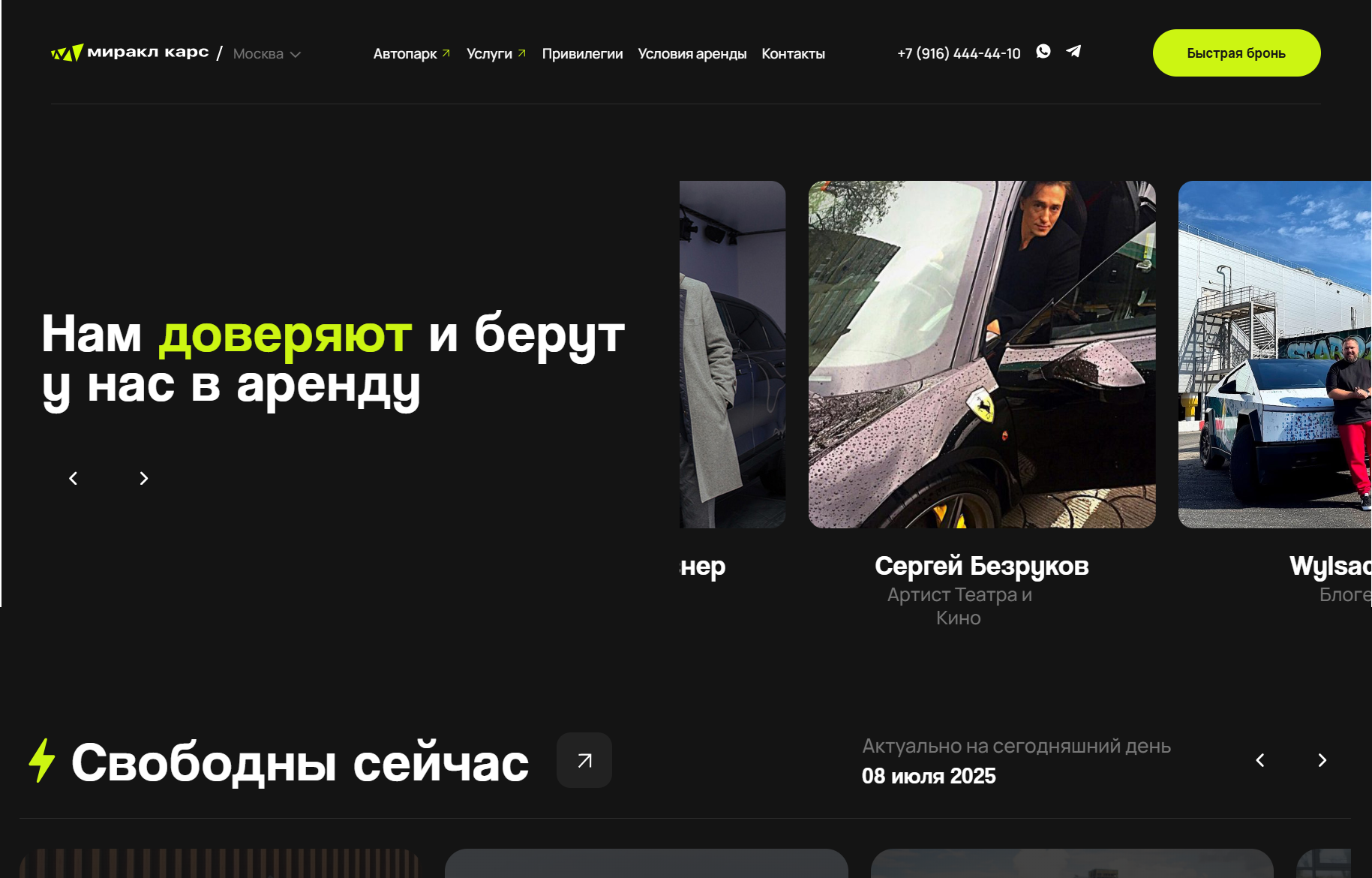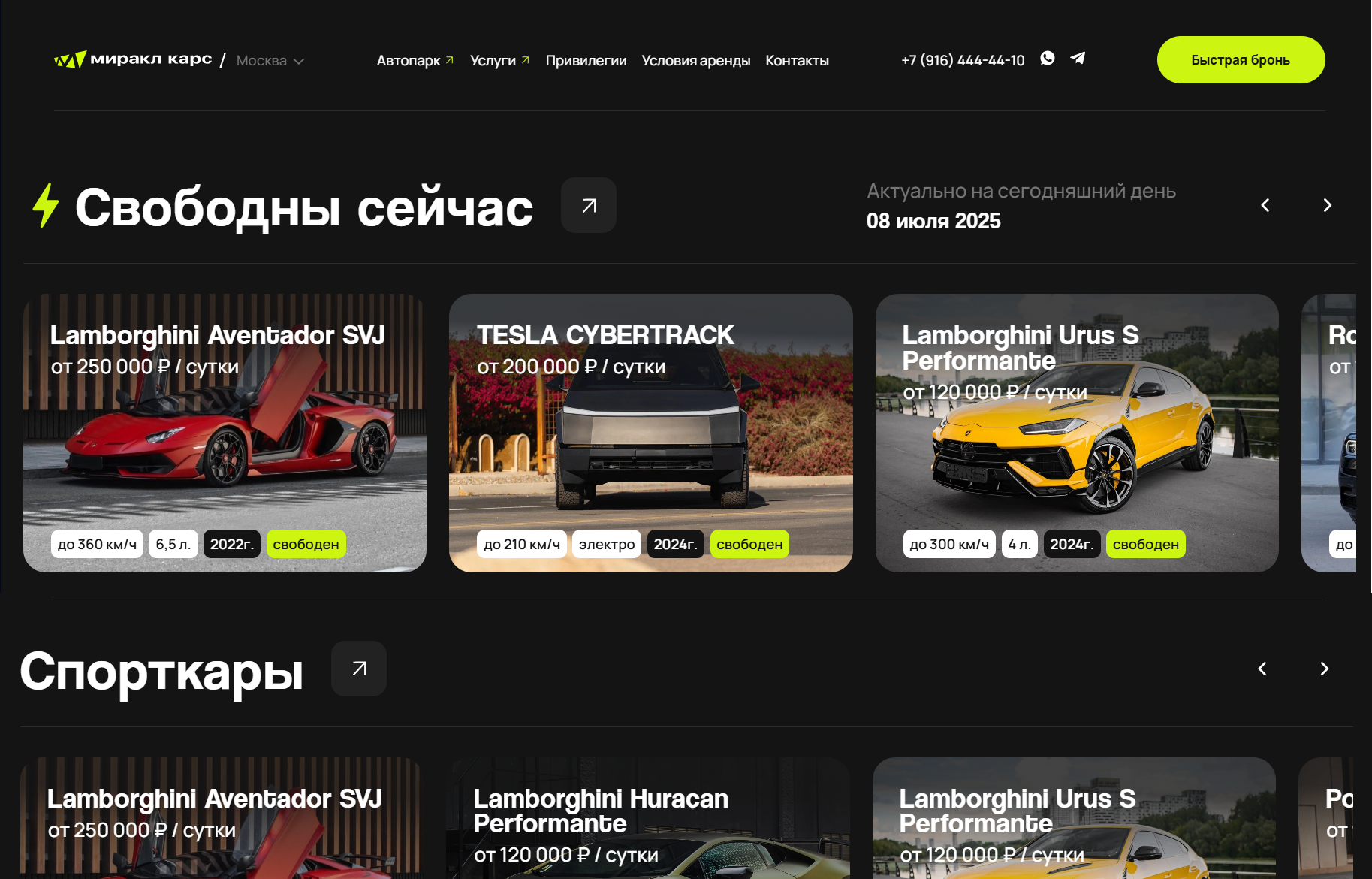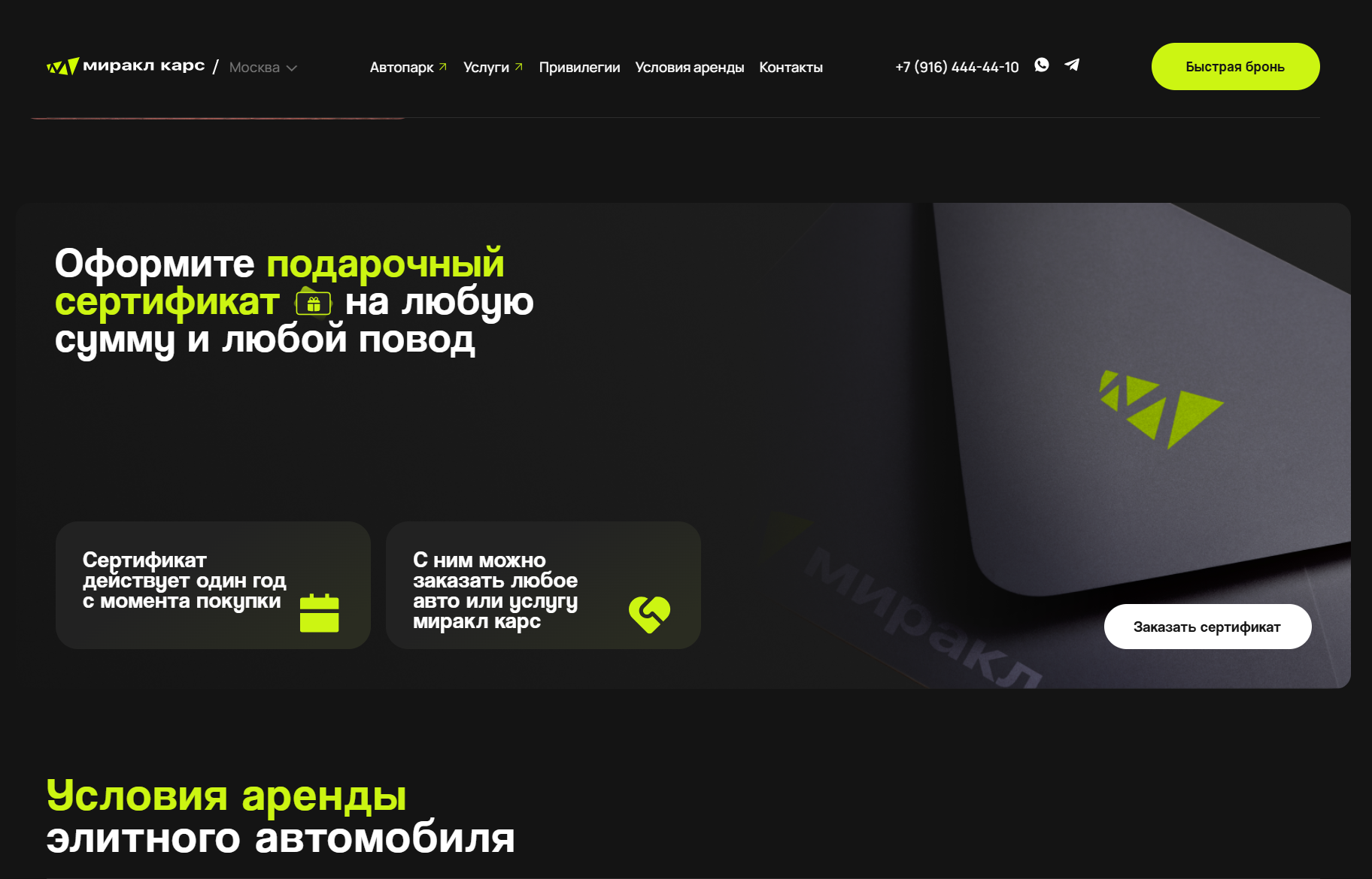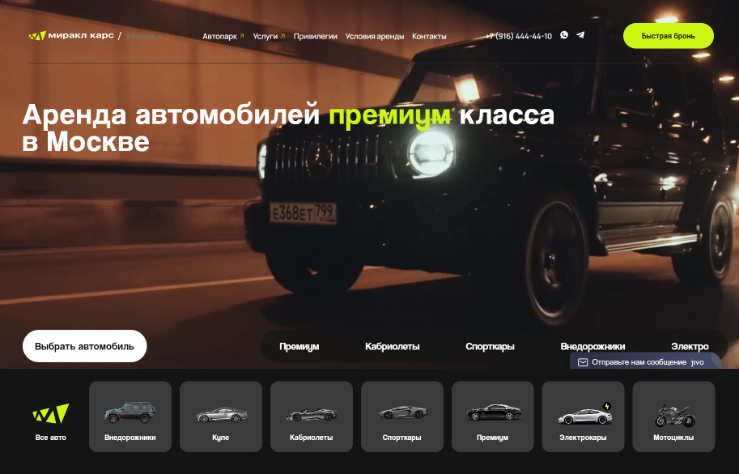 Miracle Cars — аренда автомобилей премиум-класса в Москве (2023-2024). Компания предоставляет в аренду автомобили бизнес- и люкс-класса. Услуга ориентирована на аудиторию, ценящую комфорт, статус и оперативность. Требовался сайт, способный подчеркнуть уровень сервиса и упростить бронирование.