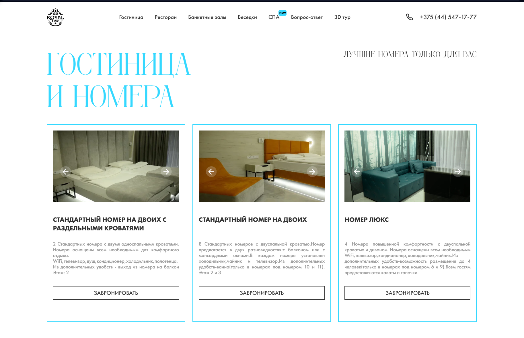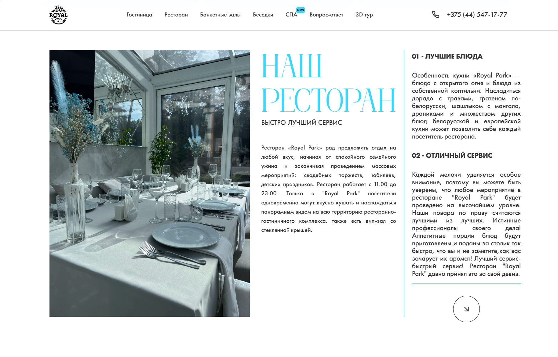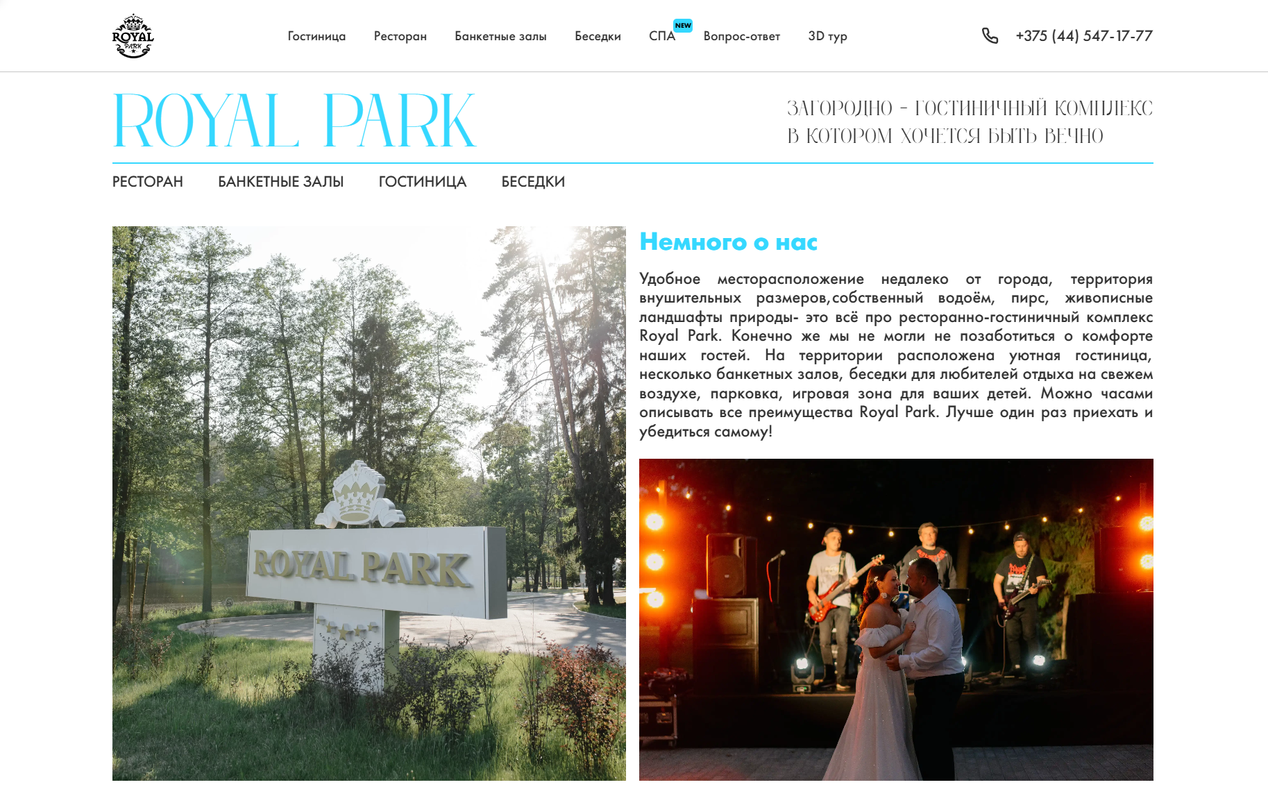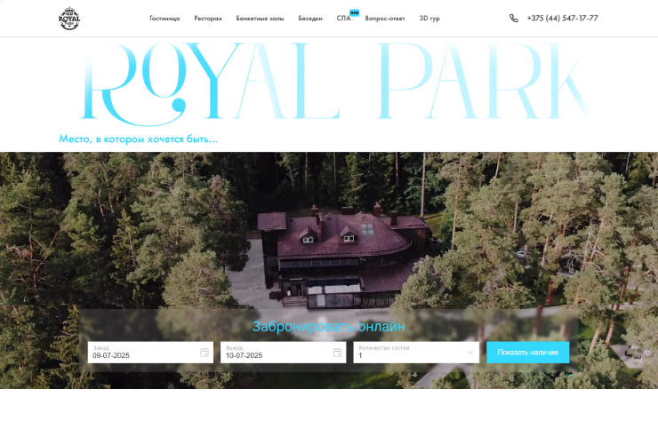 Royal Park — загородный комплекс с рестораном, гостиницей, банкетными залами и зонами отдыха. Необходим был современный сайт, объединяющий все направления, с возможностью онлайн-бронирования и презентацией локации.